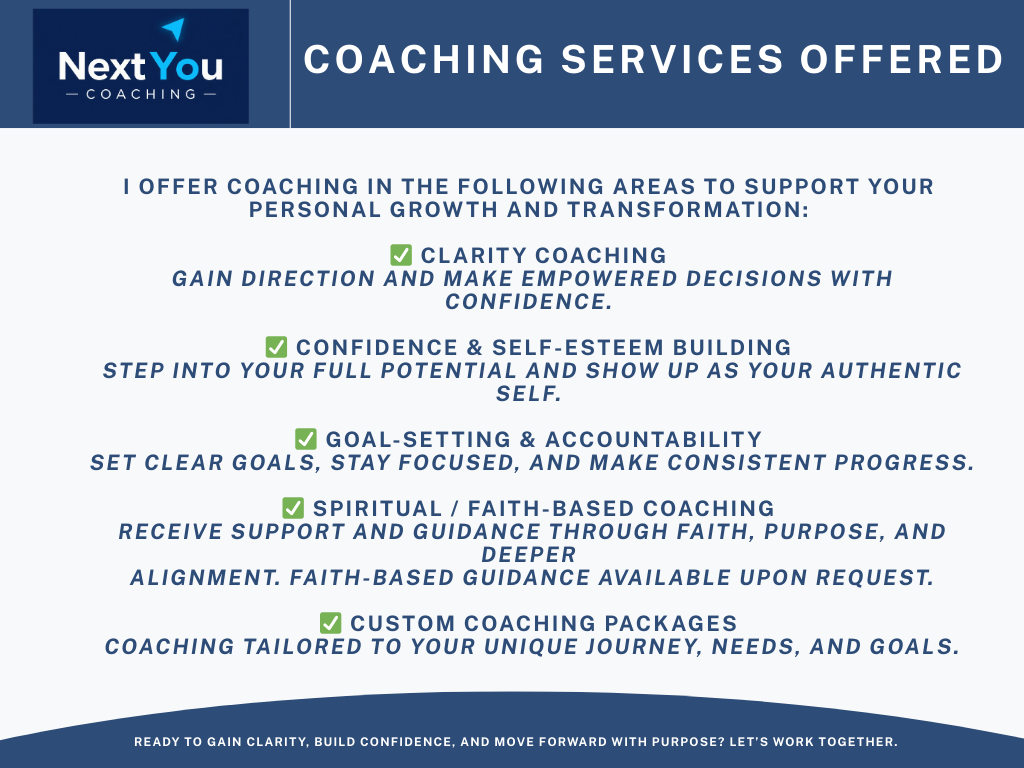 At NextYou Coaching, our mission is to guide individuals through a transformative journey of self-discovery and growth. Through personalized coaching, we help our clients break through limiting beliefs, define their purpose, and confidently create the life they envision.